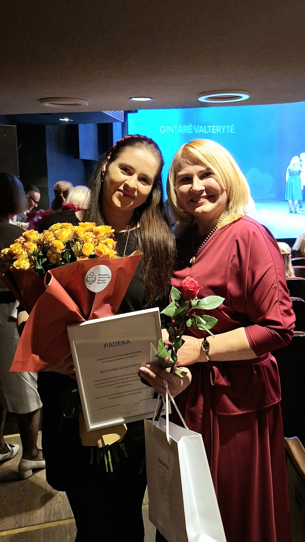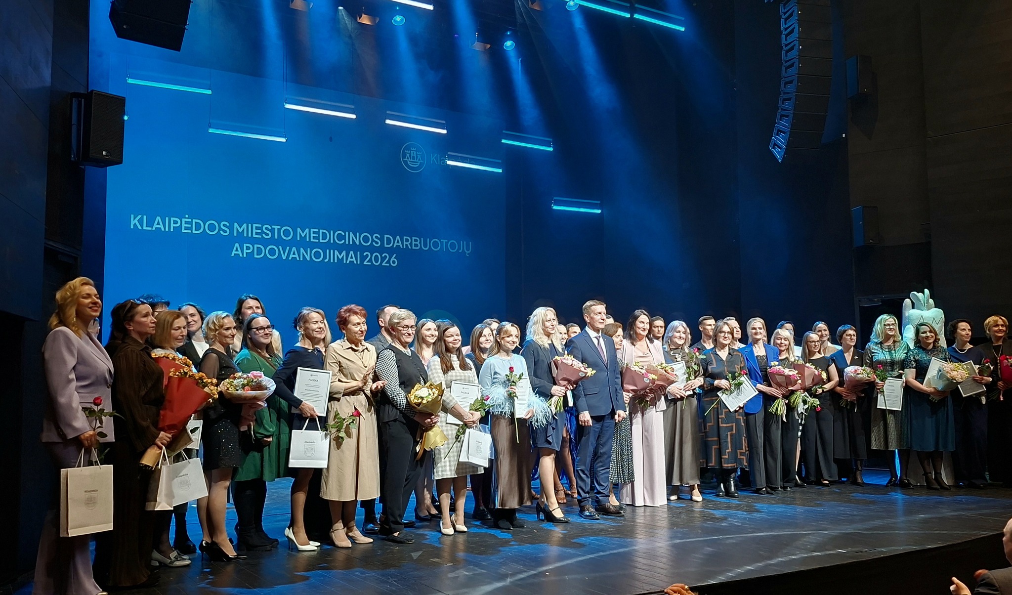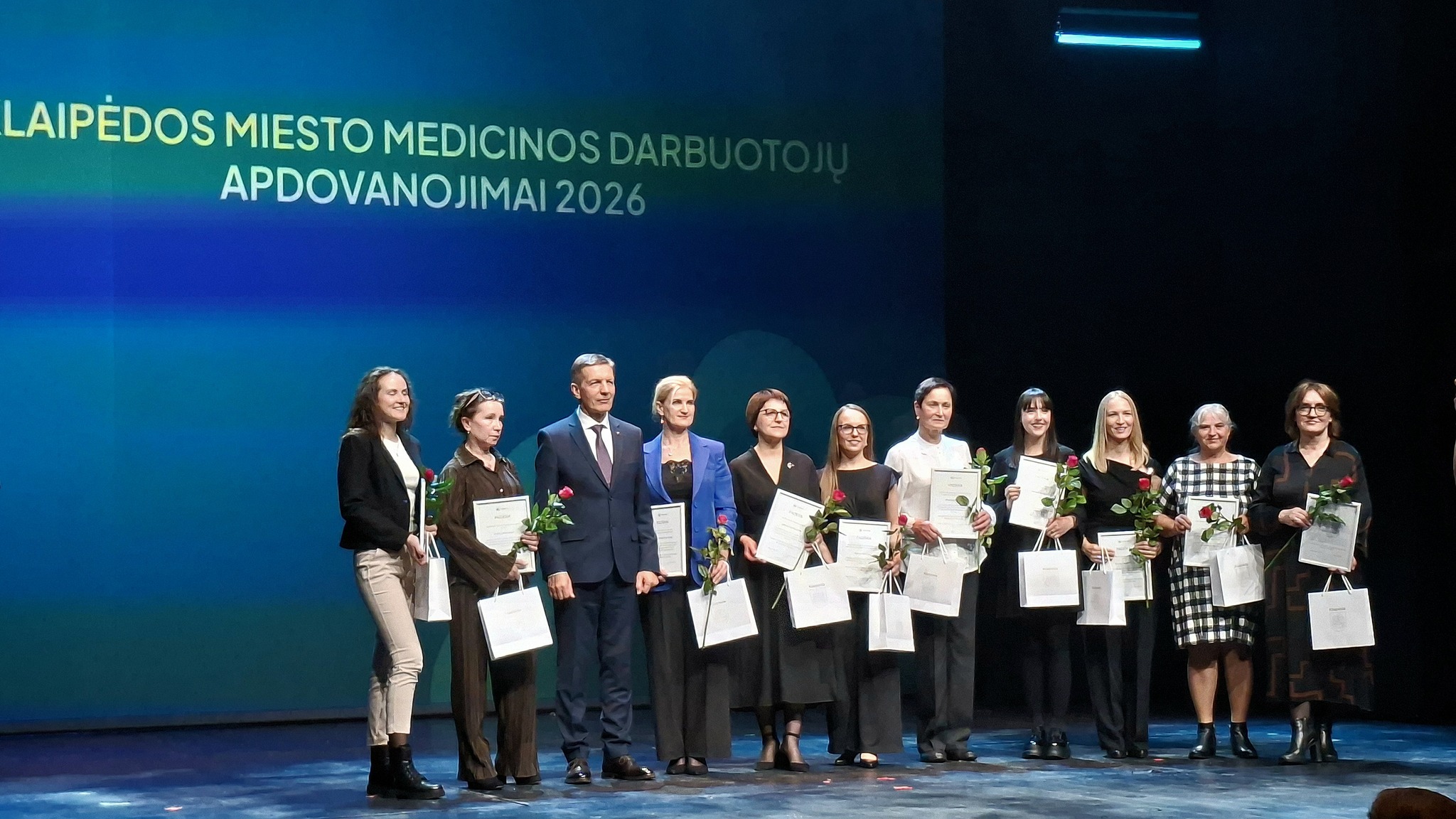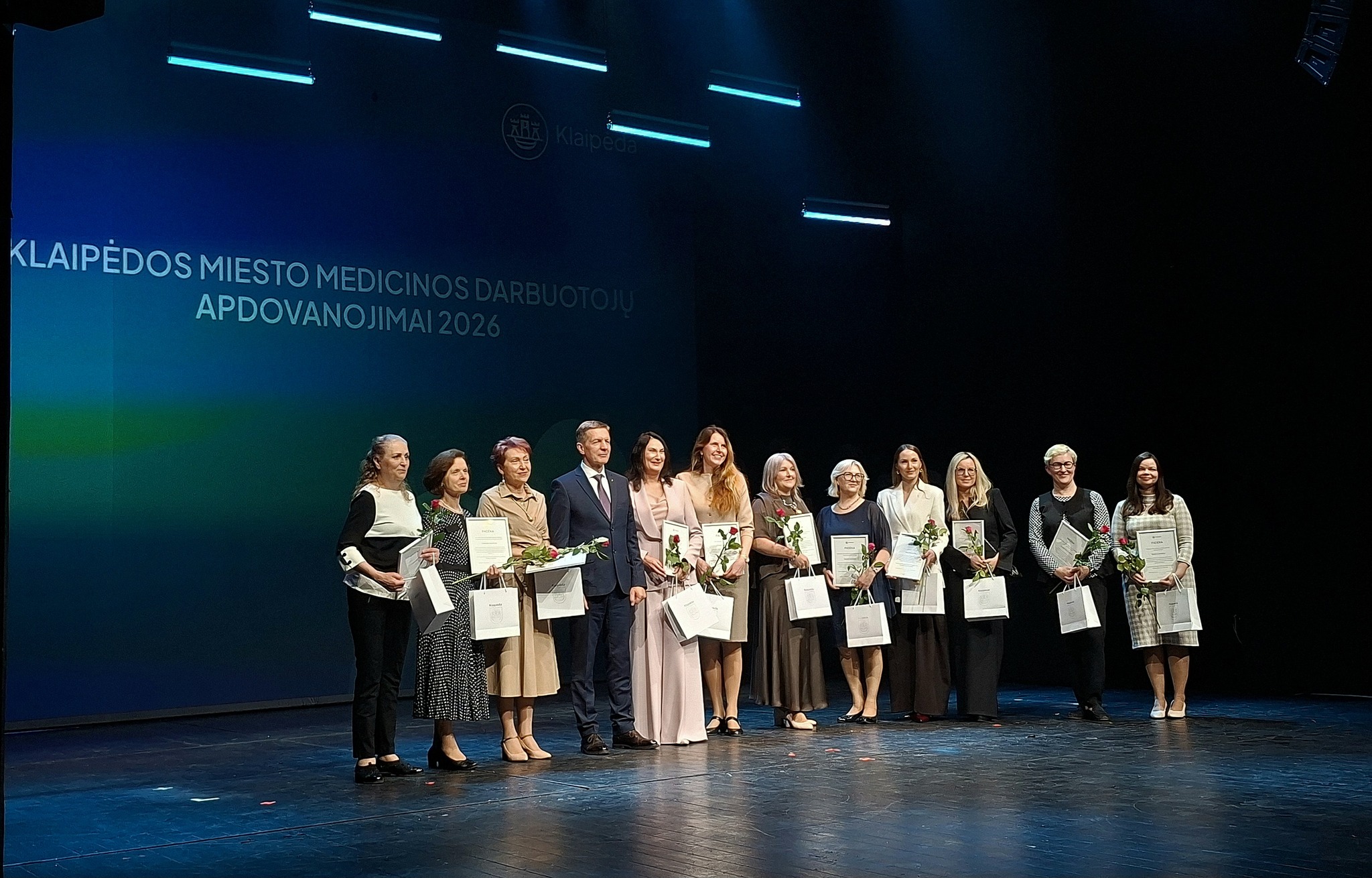 Balandžio 22 dieną Klaipėdos dramos teatre vyko iškilminga 2026 metų Klaipėdos miesto medicinos darbuotojų apdovanojimų ceremonija. Džiaugiamės visais apdovanotais medicinos profesionalais, o ypač didžiuojamės Klaipėdos medicininės slaugos ligoninės specialistėmis, kurioms Klaipėdos miesto meras Arvydas Vaitkus įteikė padėkos raštus: