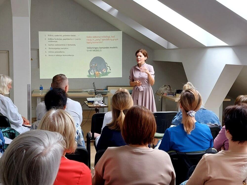 - Mokymų metu lektorė Aistė Mažeikienė nagrinėjo aktualius klausimus bei dalinosi naudinga informacija šiomis temomis: naujų kolegų integravimas į komandą, palaikymas ir vidinės motyvacijos stiprinimas, darbuotojų lūkesčiai vieni kitiems ir grįžtamasis ryšys, užduočių pasidalinimas ir bendrų sprendimų priėmimas, komandos funkcijų išsigryninimas.