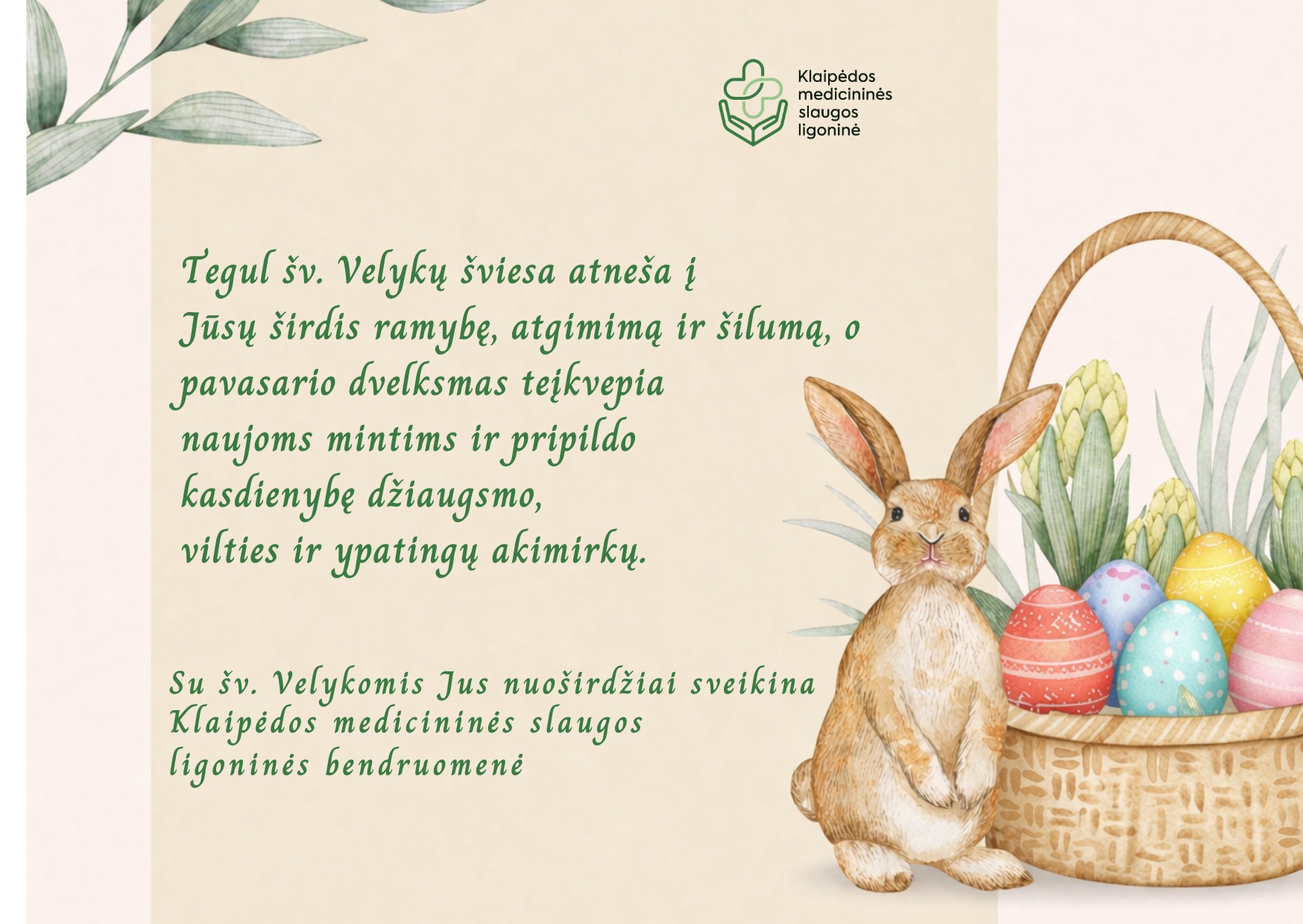 Su šv. Velykomis Jus nuoširdžiai sveikina Klaipėdos medicininės slaugos ligoninės bendruomenė!